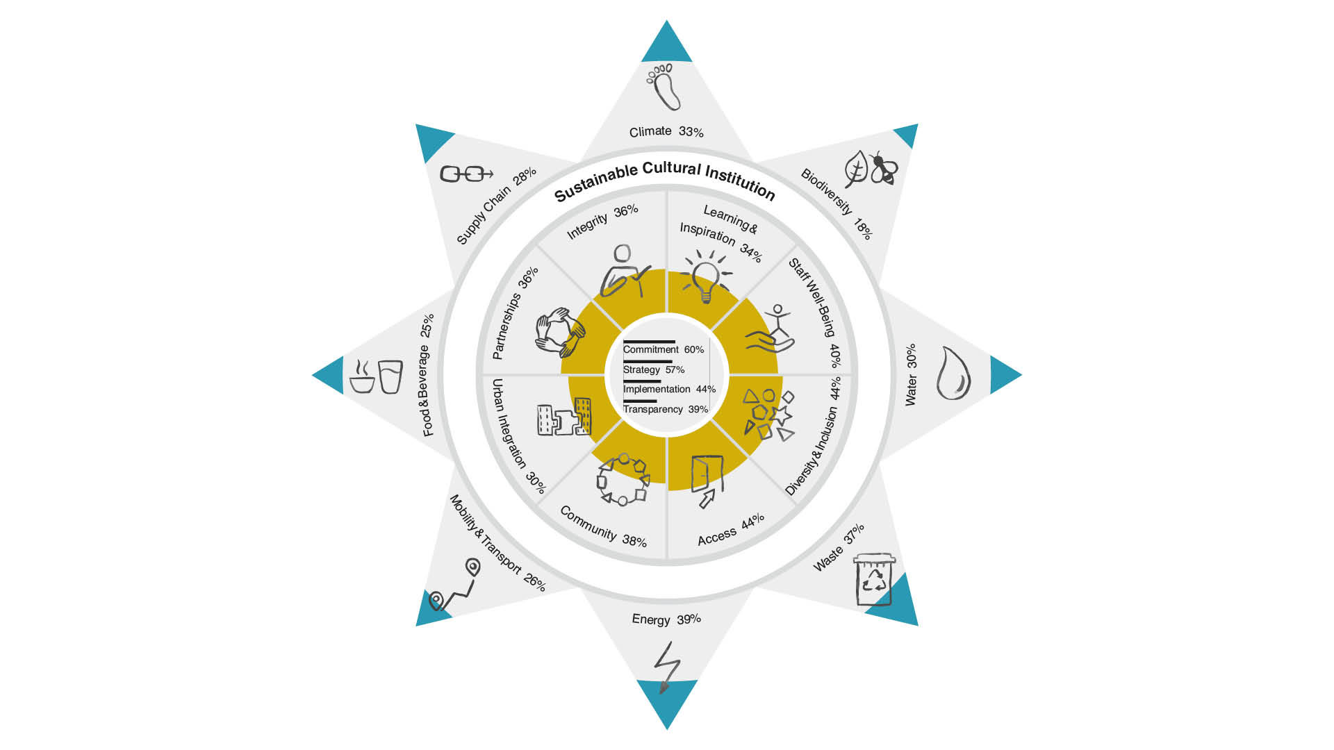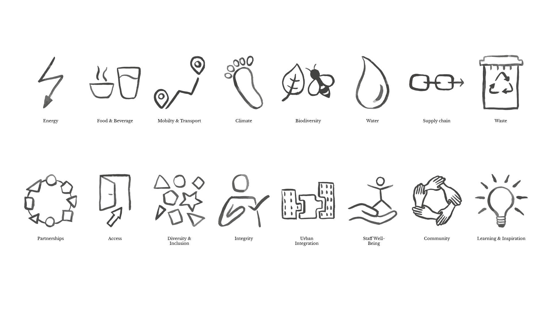 Here are the 16 pictograms in use in the sustainability star. The idea of this star is to measure and show how sustainable museums are in 16 different fields.